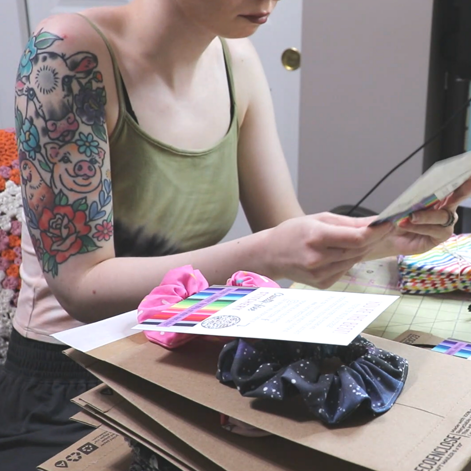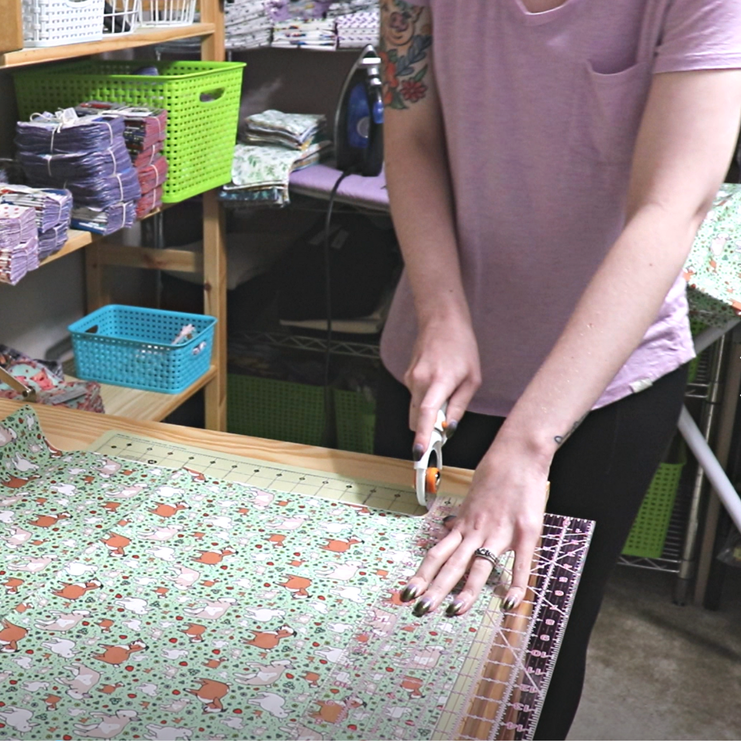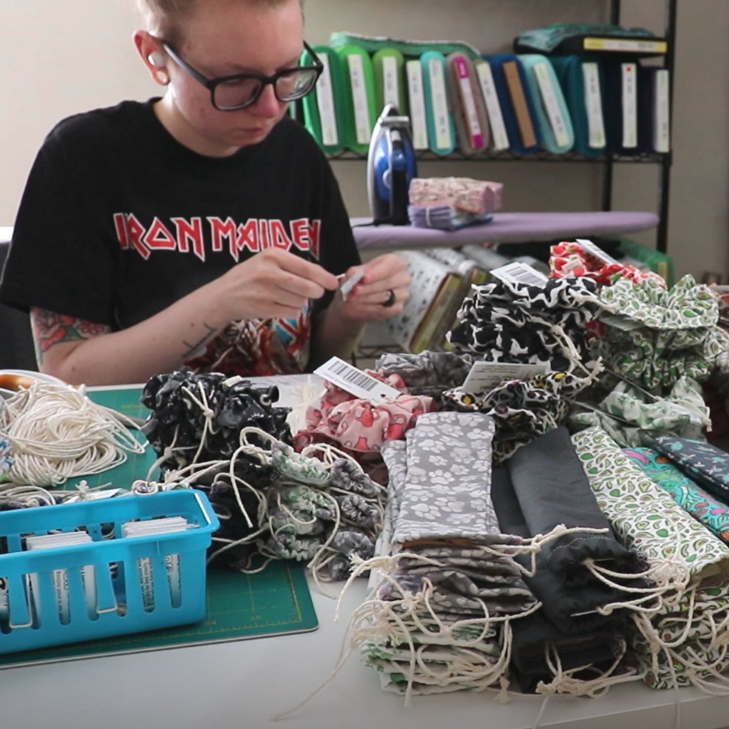 When cutting fabric! All designs are made in-house, and sized to maximize material usage - and minimize waste.