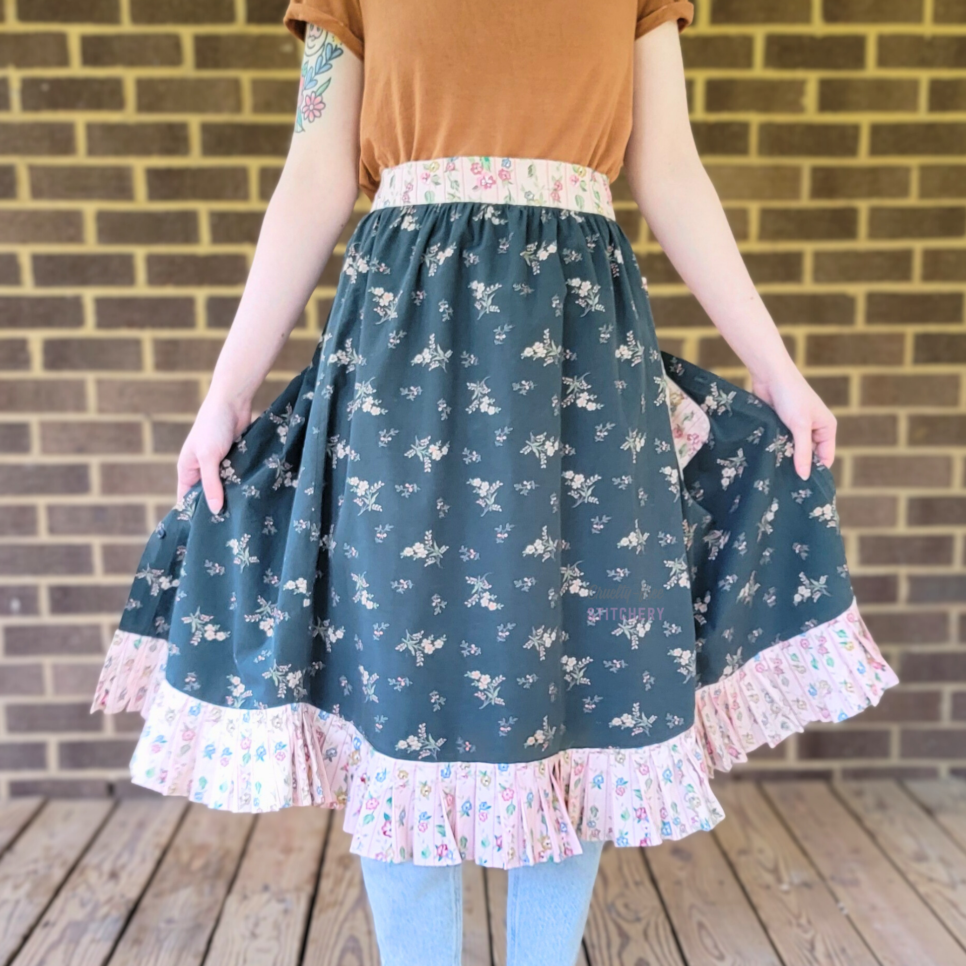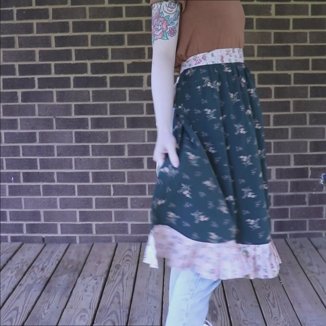 This kelly green half apron is less poofy than my other styles. Made with an upcycled button-down shirt and accented with coordinating pink and tan floral waistband and pleated ruffle hem.